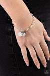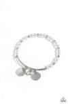 Featuring a subtle iridescent shimmer, a collection of glassy clear white beads are infused along the wrist beside dainty silver studs for a bodacious pop of color. Two silver discs and an iridescent gem slide along a sleek bar fitting on the dainty silver bangle, creating a sentimental statement. Due to its prismatic palette, color may vary.