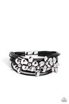 Shiny silver flowers glide along leathery black cords, clustering into a shimmery floral statement piece at the center of the wrist. Features a magnetic closure.