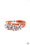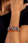 Shiny silver flowers glide along leathery burnt orange cords, clustering into a shimmery floral statement piece at the center of the wrist. Features a magnetic closure.