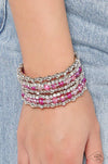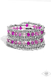 An icy collection of silver beads, cubes, opaque crystals in various pink shades, and glassy white rhinestones are threaded along a coiled wire, creating a blinding infinity wrap style bracelet around the wrist.