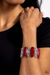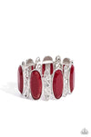 Filled with vine-like filigree, white rhinestone dotted silver frames alternate with oversized and faceted wine beads along a stretchy band around the wrist for a hearty pop of color.