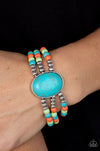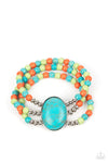 Layers of turquoise, green, and orange stone beads are threaded along stretchy bands that connect to a stunning oval turquoise stone, creating an extraordinary statement piece around the wrist.