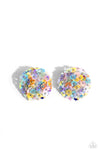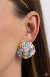 Featuring a light iridescent sheen, a collection of multicolored flowers with silver stud centers explode around the ear to create a whimsical bouquet-inspired statement. Earring attaches to a standard post fitting.