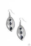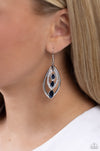 A sparkling row of marquise cut blue rhinestones stack down the center of overlapping plain silver and white rhinestone encrusted silver frames, resulting in an elegant lure. Earring attaches to a standard fishhook fitting.