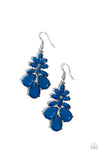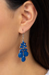 A collection of opalescent Mykonos Blue teardrop and marquise cut glassy beads coalesce into a glamorous lure, resulting in a mystical pop of color. Earring attaches to a standard fishhook fitting.