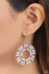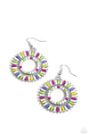 Featuring bright white, Kohlrabi, High Visibility, Rose Violet, and Persian Jewel colors, round beads adorn the inner circle of a whimsical silver studded frame, while emerald-cut beads in the same shades encrust along the outer curve of the hoop for a spinning display of color. Earring attaches to a standard fishhook fitting.