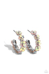 Tiny light pink iridescent flowers connect to one another as they wrap around the ear to create a charming, dainty hoop. Earring attaches to a standard post fitting. Hoop measures approximately 3/4" in diameter. Due to its prismatic palette, color may vary.