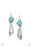 Ribbed in linear textures and dotted in silver studs, an asymmetrical silver plate links to the bottom of a turquoise stone frame for an artisan inspired design. Earring attaches to a standard fishhook fitting.