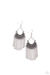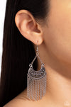 A curtain of silver chains cascades from a decorative silver half moon frame embellished in a row of hematite rhinestones, resulting in a spellbinding fringe. Earring attaches to a standard fishhook fitting.