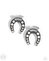 Embellished with white stones and silver-studded details, an oversized antiqued silver horseshoe hangs upside down from a curved high-sheen silver accent. Additional high-sheen textured silver squares that come to a point, cap the ends of the horseshoe for additional eye-catching color. Earring attaches to a standard clip-on fitting. As the stone elements in this piece are natural, some color variation is normal.