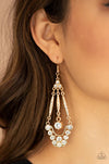A trio of glassy white rhinestones gives way to hammered gold bars attached to a bubbly white rhinestone encrusted frame. Attached to a matching gold bar, a solitaire white rhinestone swings from the center, creating a timeless chandelier. Earring attaches to a standard fishhook fitting.