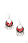 Silver teardrop beads dance from the bottom of a studded silver crescent frame that is suspended from dainty silver chains. Featuring silver petal-like accents, the rustic frame is painted in red and black finishes for a bold pop of color. Earring attaches to a standard fishhook fitting.