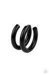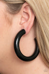 Painted in a shiny black finish, a thick wooden frame dramatically curls into an oversized hoop for a colorfully retro look. Earring attaches to a standard post fitting. Hoop measures approximately 2 1/2" in diameter.