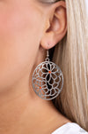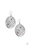 Daintily dotted with sparkling orange rhinestones, a pair of silver flowers bloom inside a circular frame for a whimsically botanical display below the ear. Earring attaches to a standard fishhook fitting.