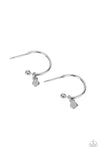 A small, skinny, silver hoop curves around the ear in a timeless fashion. A silver ball is affixed to the end of the hoop, reminiscent of a barbell fitting. A dainty silver disc slides along the curvature of the hoop, adding a surprising hint of shimmery movement. Earring attaches to a standard post fitting. Hoop measures approximately 1/2" in diameter.