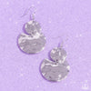 A hammered silver disc links to a thick crescent-shaped disc in the same hammered sheen, combining into a rippling layered lure. Earring attaches to a standard fishhook fitting.