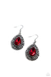Encased in a pronged silver frame, an oversized red teardrop gem is pressed into the center of silver twig-like bars that stack into an airy teardrop frame for an edgy glamour. Earring attaches to a standard fishhook fitting.