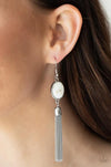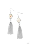 Flecks of shells are encased in a glassy silver bead that is encased in a hammered silver frame. A silver chain tassel swings from the bottom of the iridescent frame, creating an ethereal display. Earring attaches to a standard fishhook fitting.