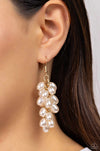 A bubbly collection of oval white pearls trickles from a single gold chain, resulting in a boisterous tassel. Earring attaches to a standard fishhook fitting.