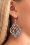 A trio of antiqued hammered silver pendants molded into irregular diamond-shaped frames in graduating sizes, nestle inside one another creating a harmoniously tinkling lure. Earring attaches to a standard fishhook fitting.