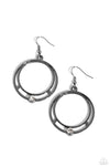A pair of slanting gunmetal bars connects two gunmetal hoops, resulting in a dizzying frame. A solitaire white rhinestone adorns the bottom of the centerpiece, adding a subtle spritz of sparkle. Earring attaches to a standard fishhook fitting.