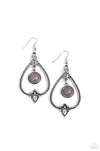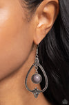 An earthy gray stone frame swings from the top of an ornately studded and textured silver teardrop frame, resulting in an earthy lure. Earring attaches to a standard fishhook fitting.