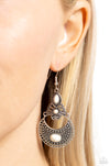A dainty collection of teardrop, round and oval white stones adorns the front of a decorative lure. Filled with frilly filigree and rustic silver studs, the mismatched frames delicately link into an artisan inspired centerpiece. Earring attaches to a standard fishhook fitting.