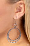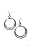 Dainty white rhinestones sparkle along the bottoms of a hammered gunmetal hoop that splits into glistening layers, creating a glamorous effect. Earring attaches to a standard fishhook fitting.