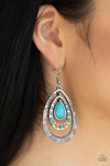Stamped in swirls and crisscrossing linear textures, two shimmery silver frames ripple from a turquoise teardrop center. The bottom of the second frame is dotted in dainty turquoise, green, and orange stones for an earthy flair. Earring attaches to a standard fishhook fitting.