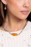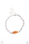 Delicately wrapped in silver wire and infused along a high-sheen silver chain, a chiseled piece of orange stone rests along the curvature of the collar, creating a decadently earthy display. Features an adjustable clasp closure. As the stone elements in this piece are natural, some color variation is normal.