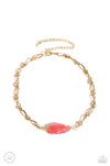 Delicately wrapped in gold wire and infused along a high-sheen gold chain, a chiseled piece of pink stone rests along the curvature of the collar, creating a decadently earthy display. Features an adjustable clasp closure. As the stone elements in this piece are natural, some color variation is normal.