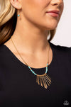 Hammered in a dotted motif, a dainty row of gold rods shimmers along an invisible wire dotted in dainty gold and turquoise stone beads. Attached to a dainty gold chain, the tapered fringe flares out below the collar, resulting in an earthy edge. Features an adjustable clasp closure.