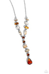 Featuring pronged silver fittings, mismatched polished white pearls and various glassy topaz, light colored topaz, and champagne gems dance along a shimmery dainty silver chain. Matching gems trickle along a single silver chain with an exaggerated topaz gem teardrop at the bottom of the design, creating an extended pendant below the collar. Features an adjustable clasp closure.