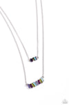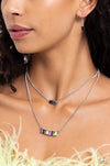 Two strands of dainty silver chains fall into tiered layers as they cascade down the chest. Featuring various multicolored shades, emerald-cut gems set in silver-pronged fittings dance along each chain for a dizzying display. Features an adjustable clasp closure.