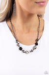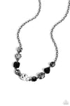 Set in gunmetal-pronged fittings, glittering geometric hematite, smoky, black, and white gem and acrylic shapes delicately coalesce around the collar on a sleek gunmetal chain for an edgy statement. Features an adjustable clasp closure.