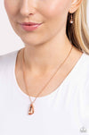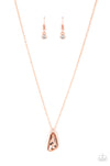 An asymmetrical coppery gem is pressed into a shiny copper frame dusted in glassy white rhinestones, resulting in a refined pendant at the bottom of a dainty shiny copper chain. Features an adjustable clasp closure.
