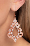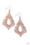 Dotted with glassy white rhinestones, paisley-like filigree frames whirl into a shiny coppery lure, resulting in a regal radiance. Earring attaches to a standard fishhook fitting.