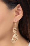 Featuring a warped hammered finish, a pair of asymmetrical gold frames delicately link into an abstract lure. Earring attaches to a standard fishhook fitting.
