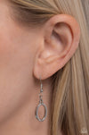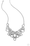 A collection of open silver frames in a variety of geometric shapes collide to create a high sheen statement piece that adorns the collar. A teardrop drops from the center of the design, adding eye-catching dimension. Features an adjustable clasp closure.