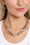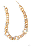 Dusted in white rhinestones, three oblong circle links combine with a strand of bold gold curb chain to drape dramatically across the chest. Features an adjustable clasp closure.