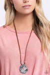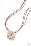 Elongated strips of brown cord, featuring infused silver accents, knot and loop through a hammered, concaved silver pendant. Row after row of multicolored stones, pink faceted beads, white pearls, and blue beads featuring a golden undertone are attached to the center of the hammered pendant, resulting in a colorfully rustic display. Features an adjustable clasp closure. As the stone elements in this piece are natural, some color variation is normal.