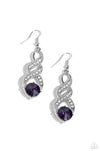 An oversized purple gem delicately attaches to the bottom of twirling white rhinestone encrusted silver ribbons, creating an elegant lure. Earring attaches to a standard fishhook fitting.