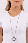 Featuring an elongated gunmetal snake chain, a shiny collection of gunmetal hoops swing from the bottom of a white rhinestone-encrusted ring, creating a dizzying pendant. Features an adjustable clasp closure.