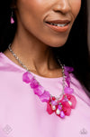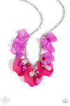 A curved cluster of cloudy Radiant Orchid and matte Viva Magenta petals drip down a silver chain resulting in a floral twist below the collar. A collection of cloudy Radiant Orchid teardrops, silver beads, cloudy Viva Magenta beads, and iridescent-dipped baroque pearls trickle between each Viva Magenta petal for additional whimsical movement. Features an adjustable clasp closure. Due to its prismatic palette, color may vary.