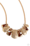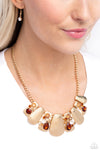A collection of hammered gold plates in various sizes delicately link below the collar, creating a boldly imperfect geometric fringe. Round and teardrop gems in various shades and sizes adorn every other frame in a haphazard pattern for an explosion of sparkle. Features an adjustable clasp closure. Due to its prismatic palette, color may vary.
