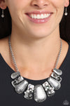 A collection of hammered silver plates in various sizes delicately link below the collar, creating a boldly imperfect geometric fringe. Round and teardrop gems in various shades and sizes adorn every other frame in a haphazard pattern for an explosion of sparkle. Features an adjustable clasp closure. Due to its prismatic palette, color may vary.