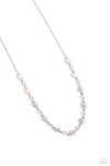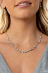 Encased in pronged silver frames, round white, Sharkskin, and other gray pearls and white gems delicately connect and alternate below the collar on a dainty silver chain for a seasonal flair. Features an adjustable clasp closure.