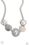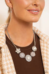 A refined display of shimmery pearl charms and floral-inspired accents gather below the collar creating a cultivated display. The hodgepodge of texture and sheen includes pearl-adorned flowers in various shapes, borders of white rhinestones around an oval pearl center, and tactile silver studs emanating in a twisted pattern. Features an adjustable clasp closure.