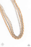 Mismatched strands of gold box chains layer with glitzy rows of dainty white rhinestones in pronged silver fittings across the chest, resulting in an edgy industrial collision. Features an adjustable clasp closure.