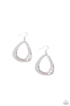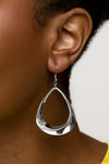 A thick, asymmetrical silver teardrop frame glides from the ear, creating an unexpectedly refined statement. Earring attaches to a standard fishhook fitting.